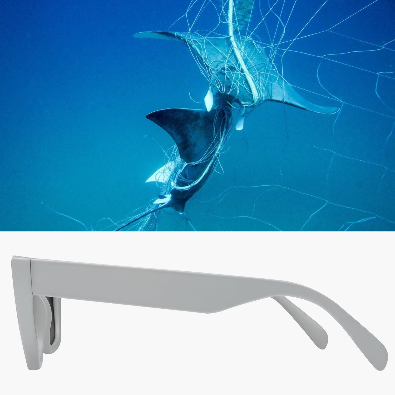 The Atlantic Ocean sunglasses, made from recycled fishing nets, honor this vital waterway and symbolize the currents of change, urging action for a cleaner future.